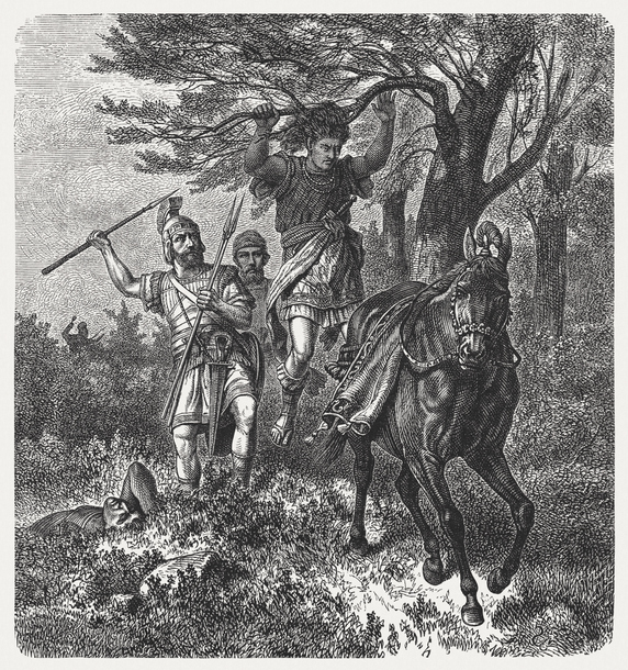 75.不久,大卫召集军队应战押沙龙的军队。在接下来的战役,押沙龙骑着他的骡子,从大橡树密枝底下经过,他的头被橡树夹住,悬挂在空中,所骑的骡子就离他去了。有一土兵看见他,但不敢杀他,就告诉约押。约押和他的士兵却毫无顾忌、毫不犹豫,即时杀了他。