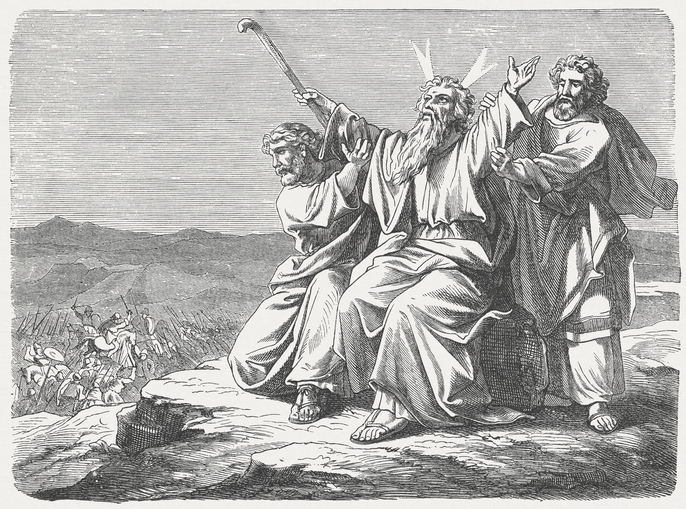当战事激烈进行时,摩西站在山顶上,双手高举,向神祈求。只要他的手举着,以色列人便占上风;但当他疲倦、手垂下时,亚玛力人便反而得势。亚伦和户珥见状,便让摩西坐在石头上,一人扶着一边,使他的手得以稳定高举,直到日落。