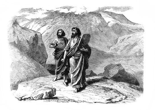 2.我们在西奈山再见到约书亚,在那里他和摩西同去领受神的十诫。他明显在中途停留 (出24:13),在摩西和神同在的整整四十天等待,直到摩西回来,去应付人民对神的叛变。因此,约书亚没有参与金牛犊的崇拜。