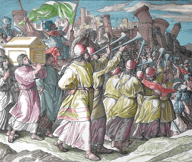 在第七次绕行结束时,当祭司们吹羊角的时候,约书亚吩咐人们呼喊,他们就大声呼喊。当他们这样做时,奇迹就发生了。