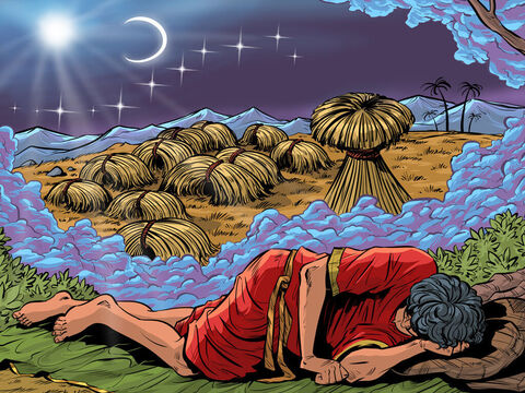 他梦见自己在田里捆禾稼,他的捆起来站着,但他哥哥们的捆围着他的捆下拜。这梦的意义非常明显,即时说有一天所有十一个兄弟都会受到他的管治,向他下拜。