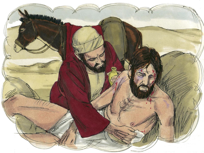 一位撒瑪利亞人正好經過,看見這受傷的猶太人,心中便動了慈心。雖然猶太人一向鄙視並憎恨撒瑪利亞人,他卻毫不計較,反而主動伸出援手。他走近,用油和酒倒在傷口上為他消毒,並細心包裹。隨後,他扶起那人坐上自己的牲口,帶到旅店去照料。