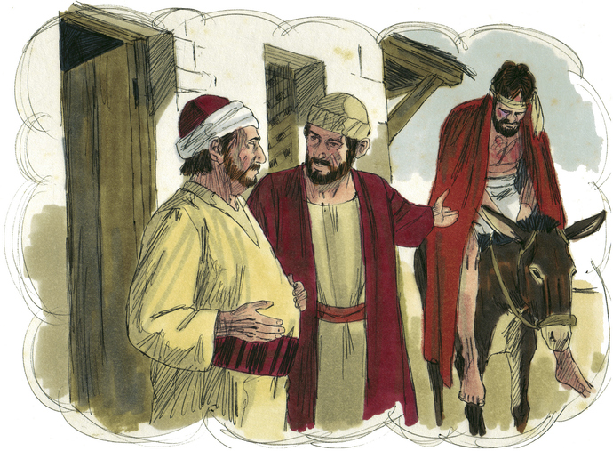 有一人從耶路撒冷下到耶利哥的路上,遭遇強盜。他們搶奪他的財物,把他打得半死,丟在路旁。此時,一位祭司經過,看見他卻從另一邊走過去。又有一位利未人路過,也看見他,卻同樣避開而去。